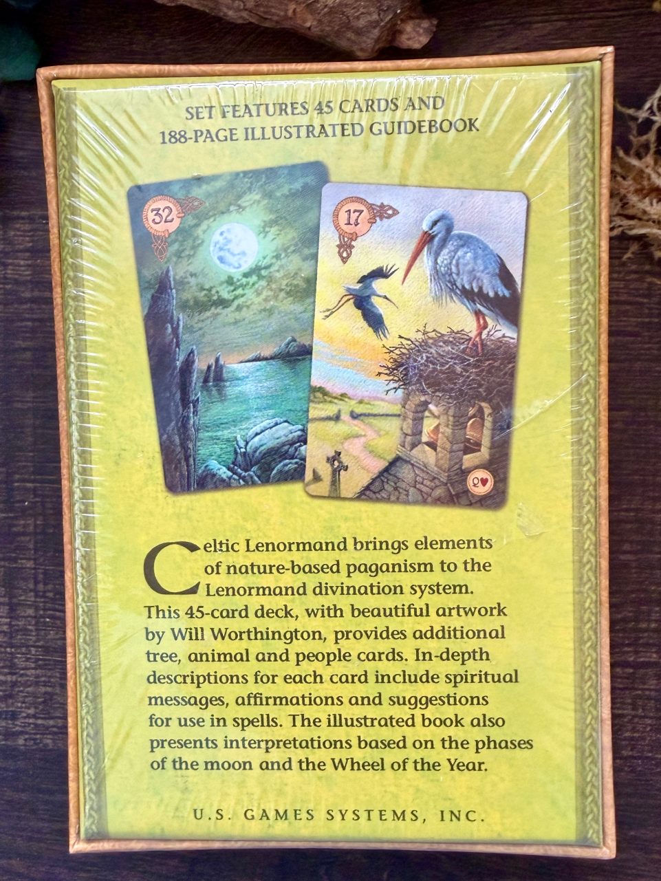 Celtic Lenormand brings elements of nature-based paganism to the Lenormand divination system. This 45-card deck, with beautiful artwork by Will Worthington, provides additional tree, animal and people cards. In-depth descriptions for each card include spiritual messages, affirmations and suggestions for use in spells. The illustrated book also presents interpretations based on the phases of the moon and the Wheel of the Year.