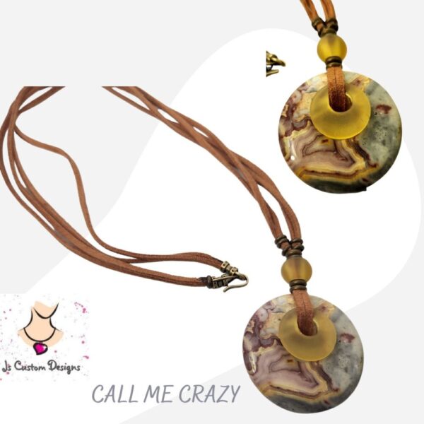 CRAZY LACE Agate Donut with yellow sea glass accent. All on a 26 inch leather suede cord accented with antique brass. Crazy Lace Agate stone is called “the laughter stone” Its belived to ward off the “evil eye” , bringing joy and absorbing emotional pain, creating protection and balance.