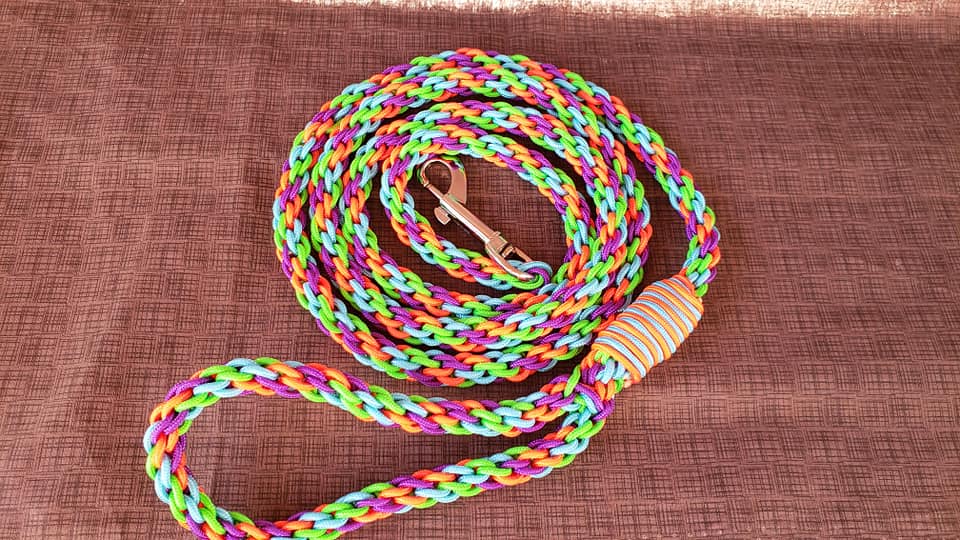Custom dog leash in 3 styles, standard, double standard, mecate braid. All are pictured for reference. Standard is the thinnest option (4 strands), but still strong. Double standard is the same braid as standard, but double the cord (8 strands). Mecate braid is 8 strands braided about 1/4″ core for the thickest leash. All around 5.5-6 feet in length. All paracord is made in the USA.