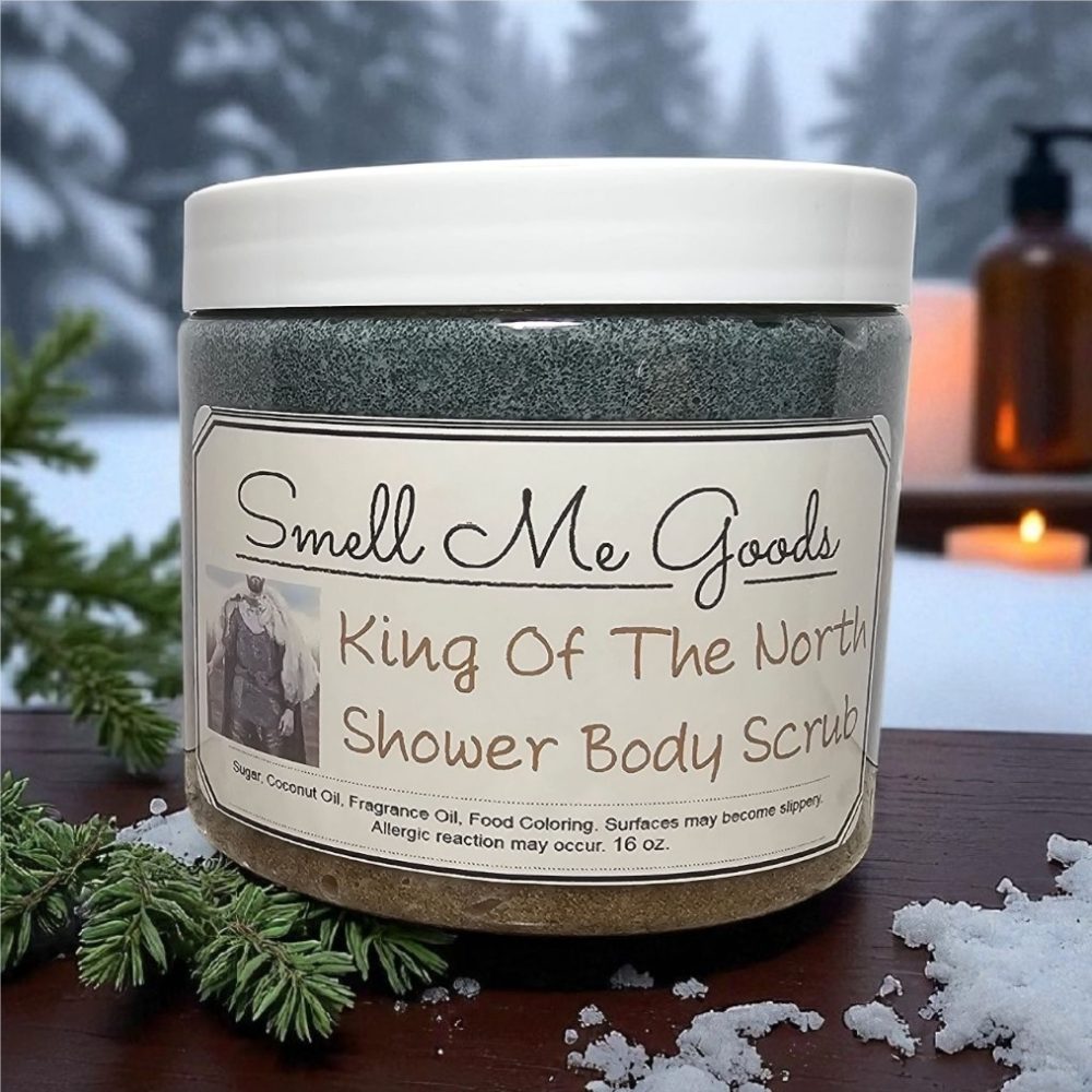 Introducing the King Of The North Shower Body Scrub, a luxurious grooming essential for the modern man. This invigorating scrub is designed to awaken your senses with its captivating scent, while its exfoliating properties gently remove dead skin cells, leaving your skin feeling refreshed and revitalized. The moisturizing formula ensures that your skin stays hydrated and nourished, even after the toughest battles. With notes of crisp citrus and eucalyptus mingling with hints of cold morning air, the scent of this scrub will transport you to the rugged landscapes of Winterfell. This masculine fragrance is completed with notes meadow grass and cedarwood, making it fit for the King. Embrace your masculinity and indulge in the ultimate shower experience with King Of The North Shower Body Scrub.