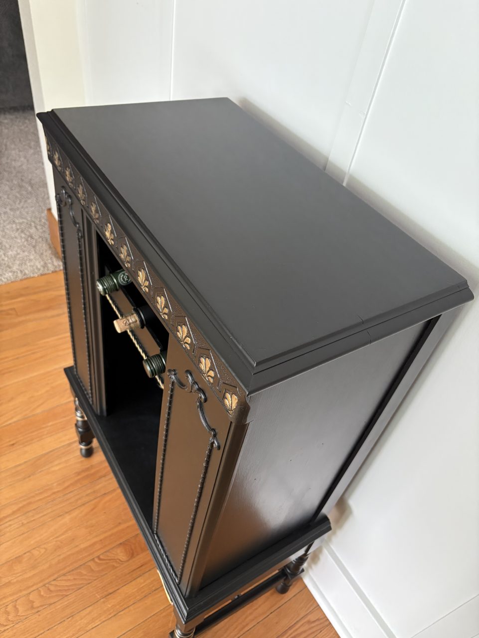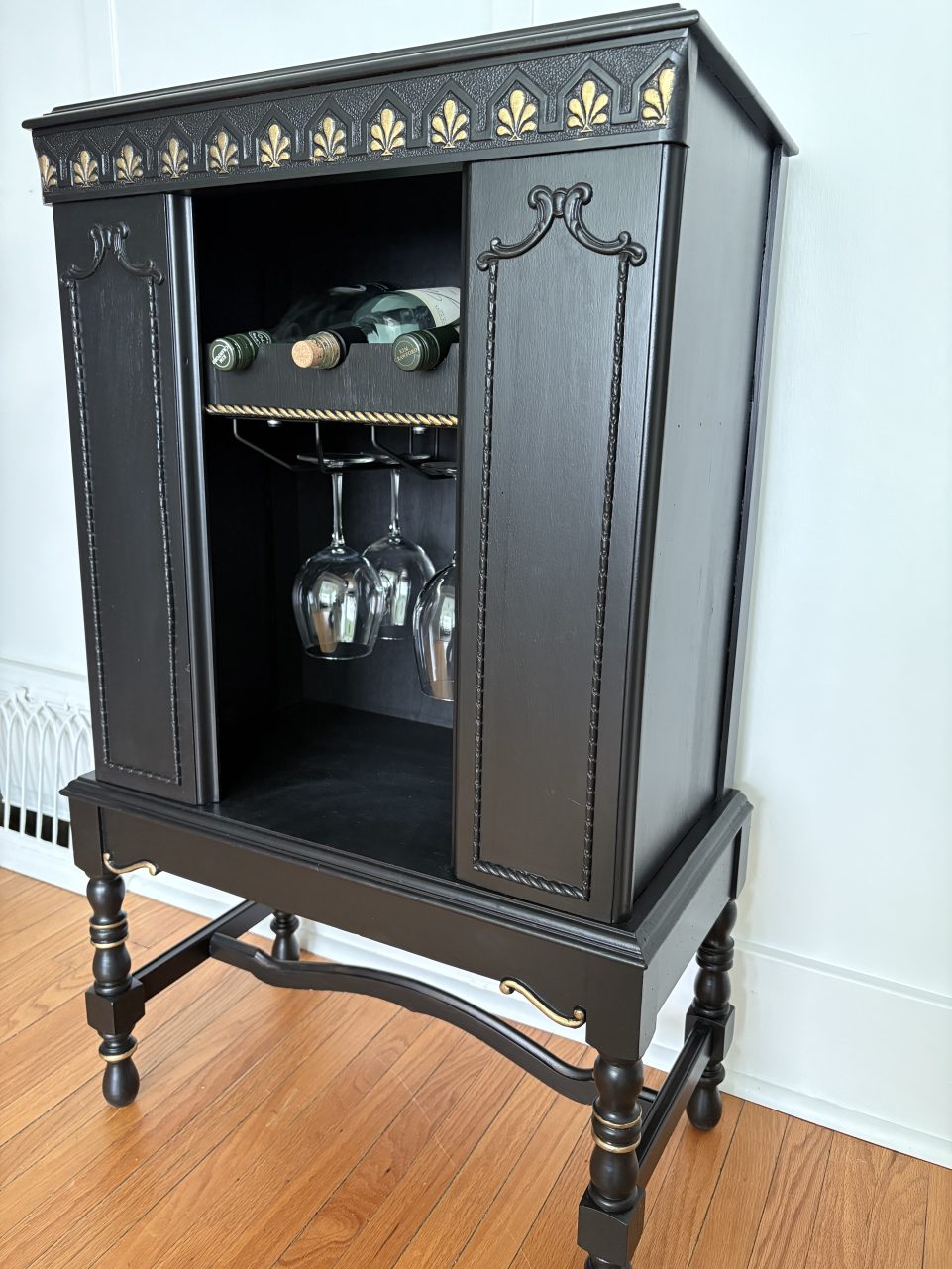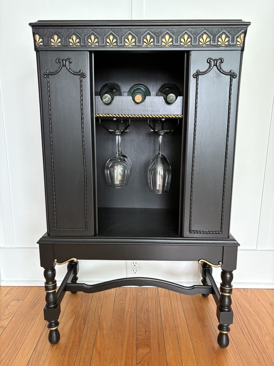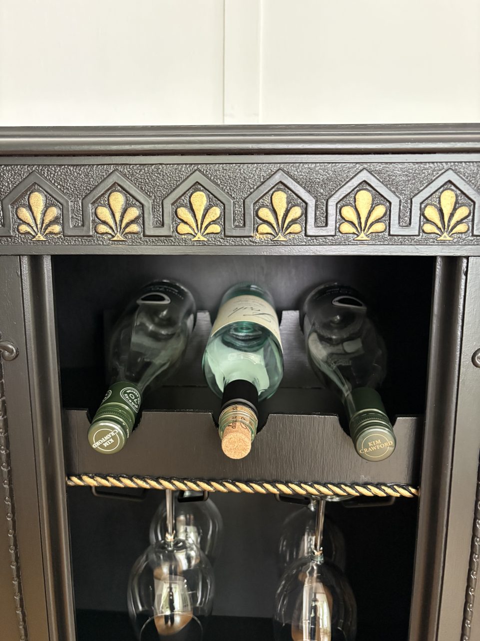This piece wears Limousine Black by Behr with touches of gold. Hang glasses below with extra storage for more bottles and gadgets.
