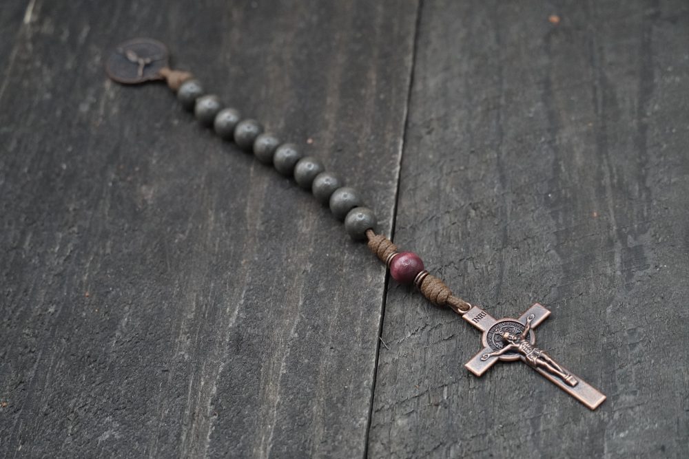 What makes this Rosary different? It’s stout, yet small enough to fit comfortably inside your pocket. Each wood bead absorbs the stain differently and is completely unique—and we design the colors ourselves here at our studio in Fargo, North Dakota.