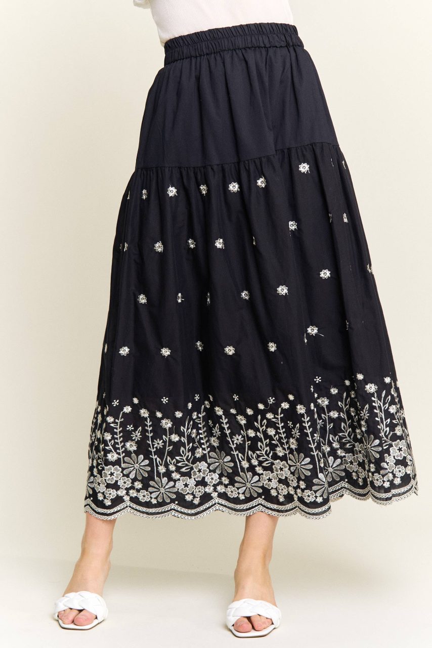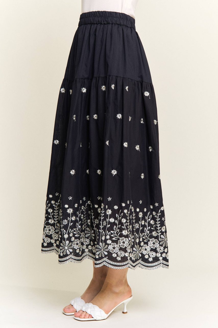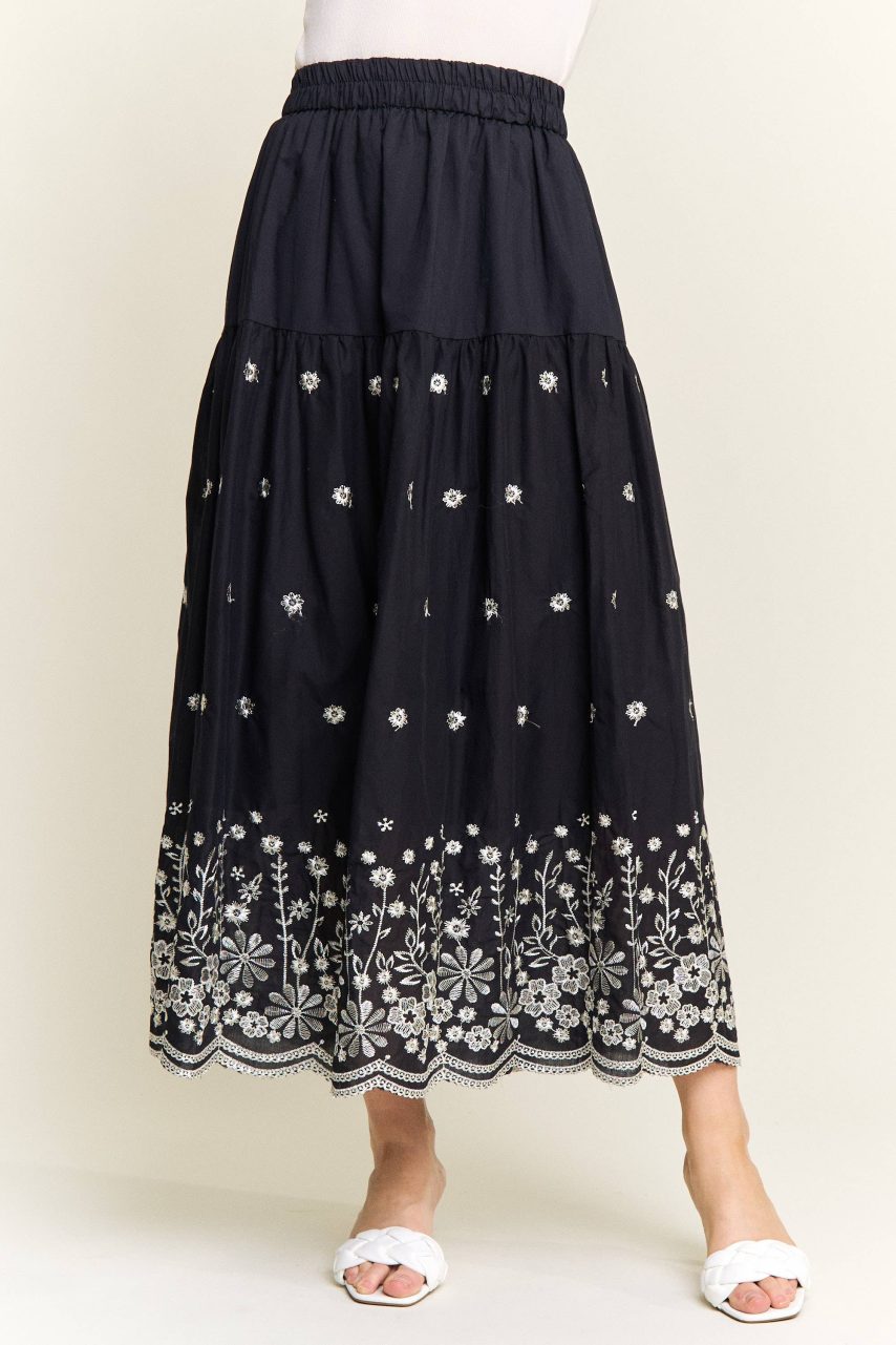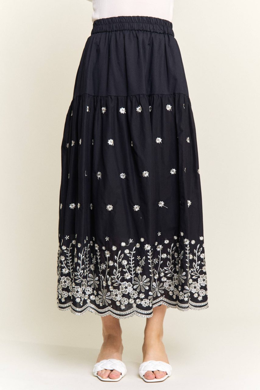 This skirt features a tiered silhouette, crafted from 100% cotton for the main fabric, ensuring breathability and comfort. The design is enhanced with delicate embroidery scattered across the tiers. The hemline boasts a more intricate floral embroidery pattern, adding a touch of artisanal charm and visual interest. The waistband is elasticized, providing a flexible and comfortable fit. offering a lightweight feel. 100% COTTON, CONTRAST: 65% POLYESTER 35% COTTON *Floral Embroidery *Tiered design *Scalloped hemline *Elastic waistband Actual product color may vary from the images shown.Â