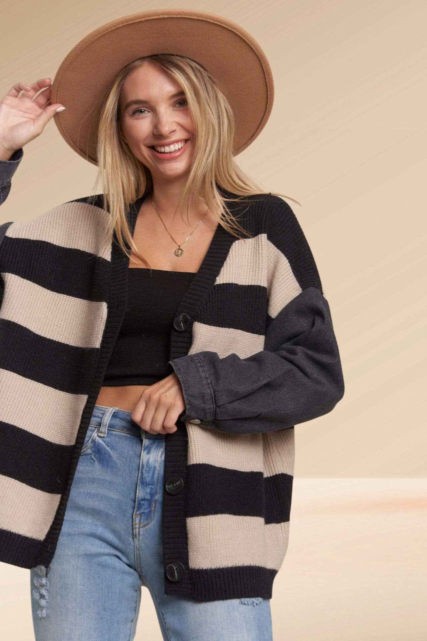 The main section of the garment is designed with a distinct striped pattern, offering a classic yet eye-catching look. This knitted portion is complemented by sleeves made from a denim-like fabric, introducing a different texture and a touch of utilitarian style. The overall design is a fusion of comfortable knitwear with the durable feel of denim, resulting in a distinctive and fashionable cardigan.