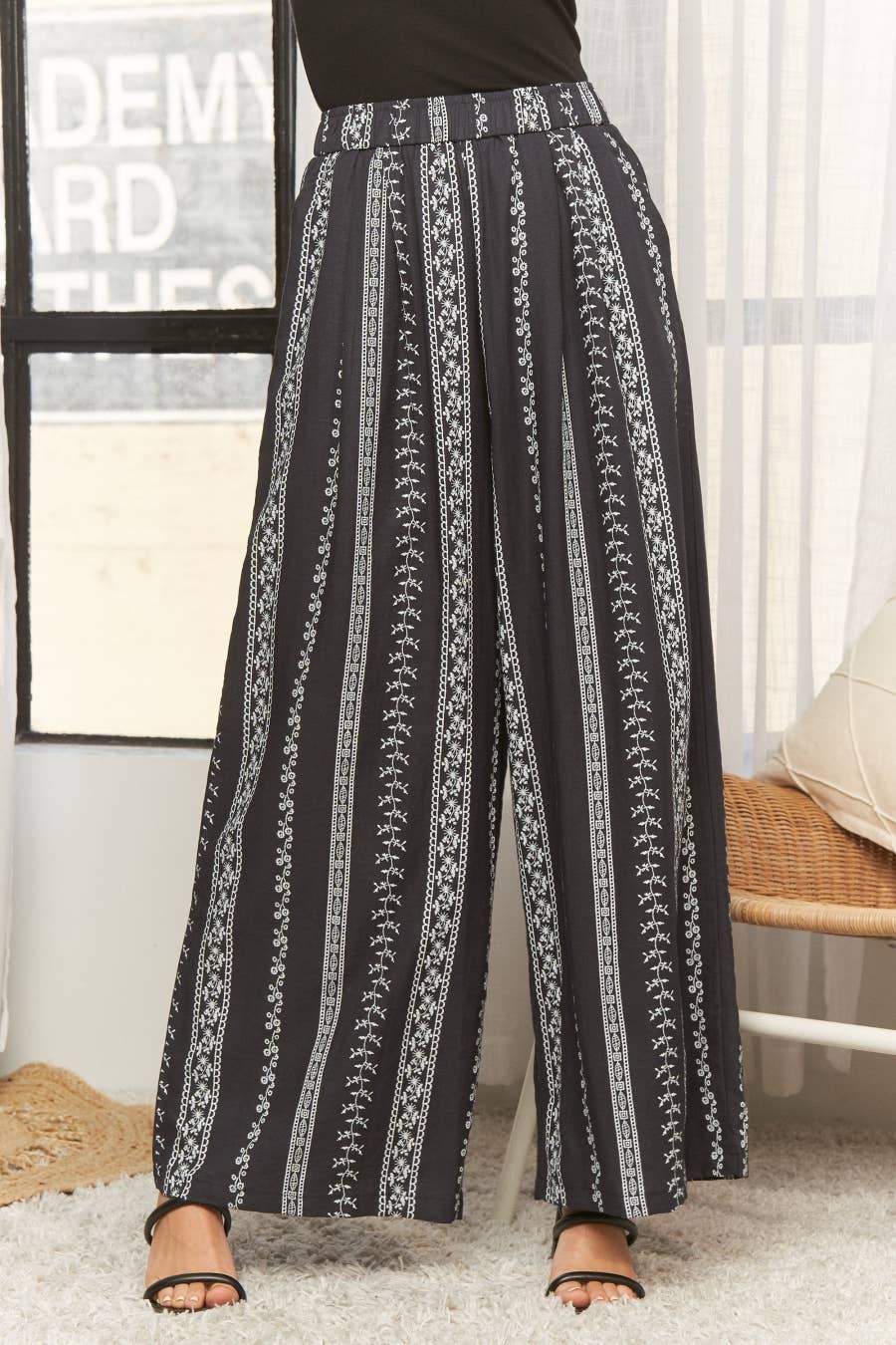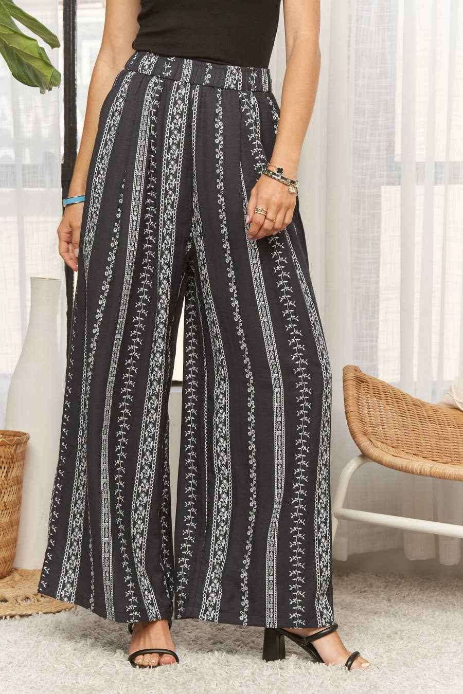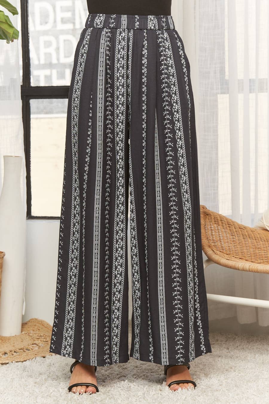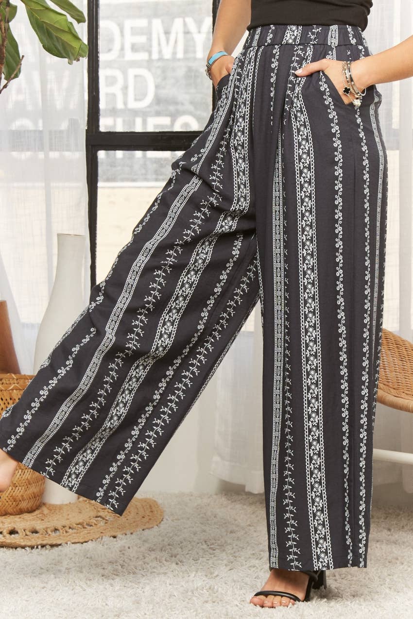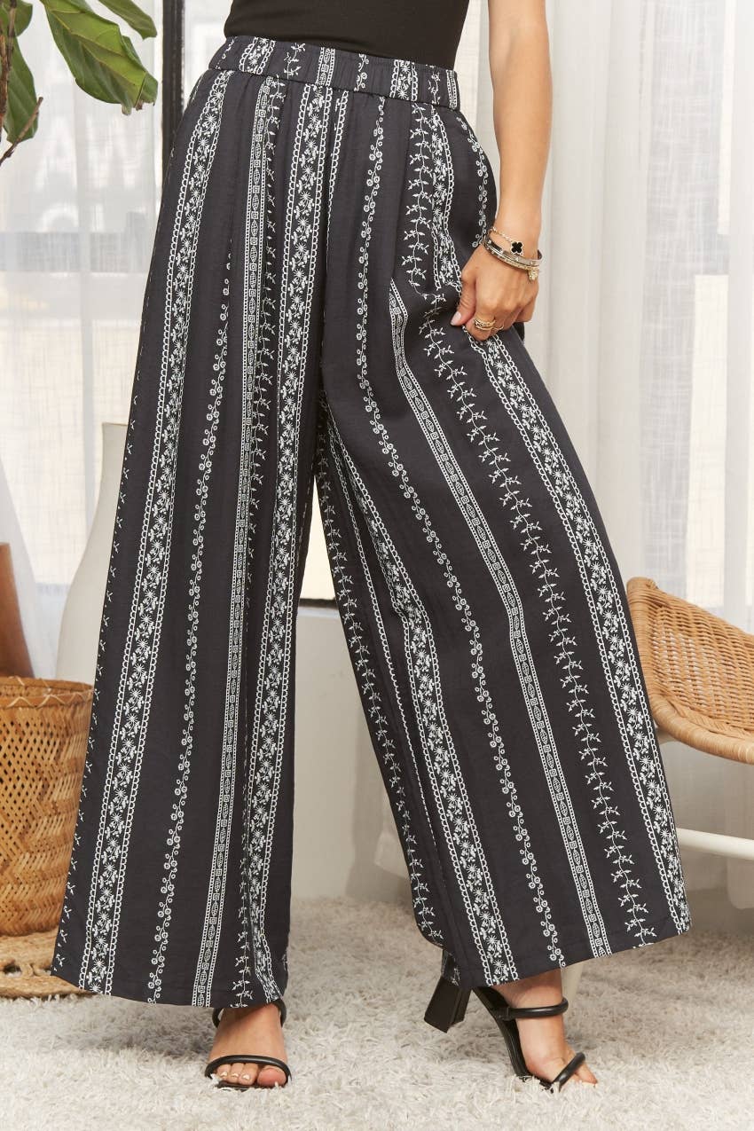 These trousers are crafted from a blend of 63% Rayon, 25% Nylon, and 12% Linen, offering a comfortable and breathable wear with a subtle texture. They feature a wide-leg silhouette that provides a relaxed and flowy fit, perfect for a casual yet chic look. The design is enhanced by a striking patterned print composed of vertical stripes adorned with delicate floral and geometric motifs, creating a visually appealing aesthetic. These are so cute! Dry clean only