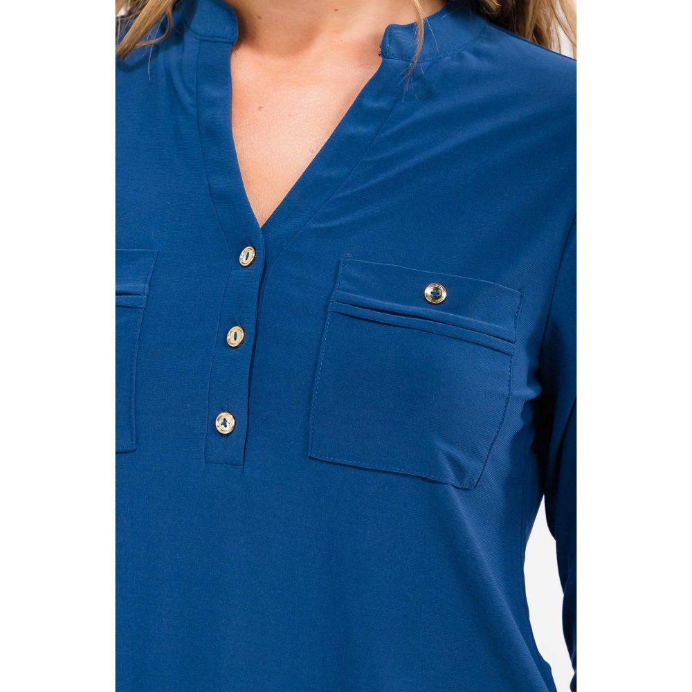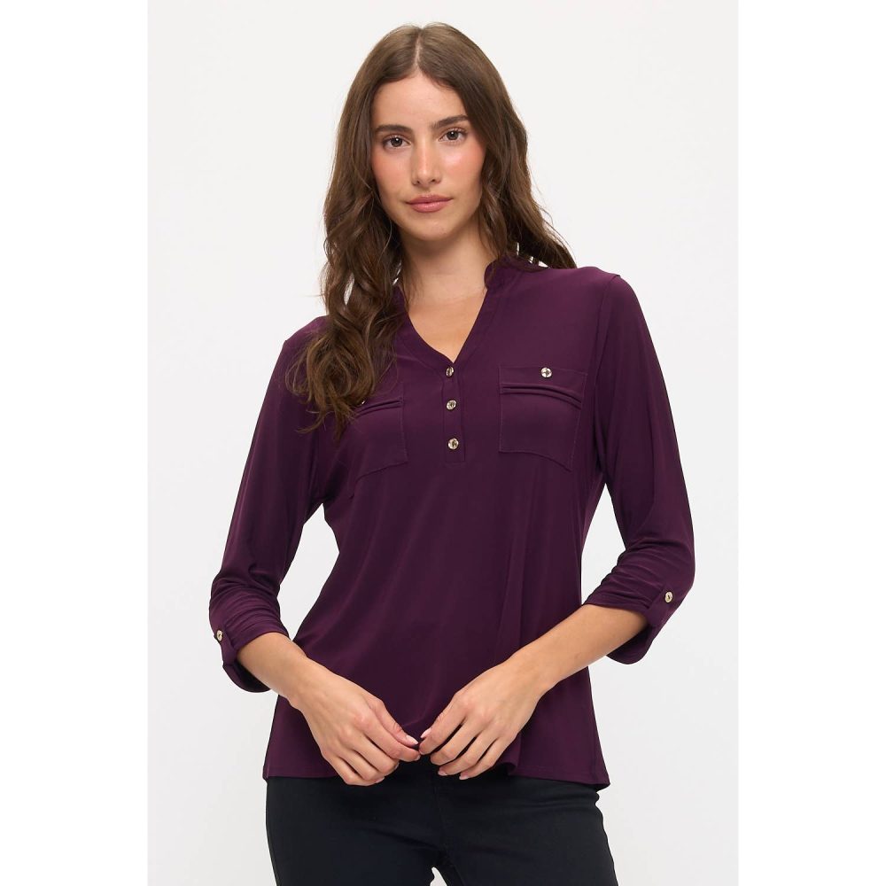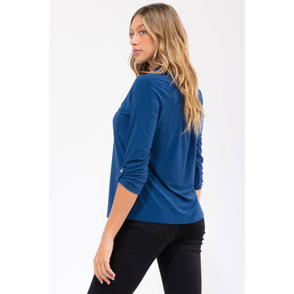 Lightweight and stretchy – Mandarin collar round neck – Button front – 3/4 Roll-tab sleeves – Faux pockets – Relaxed fit