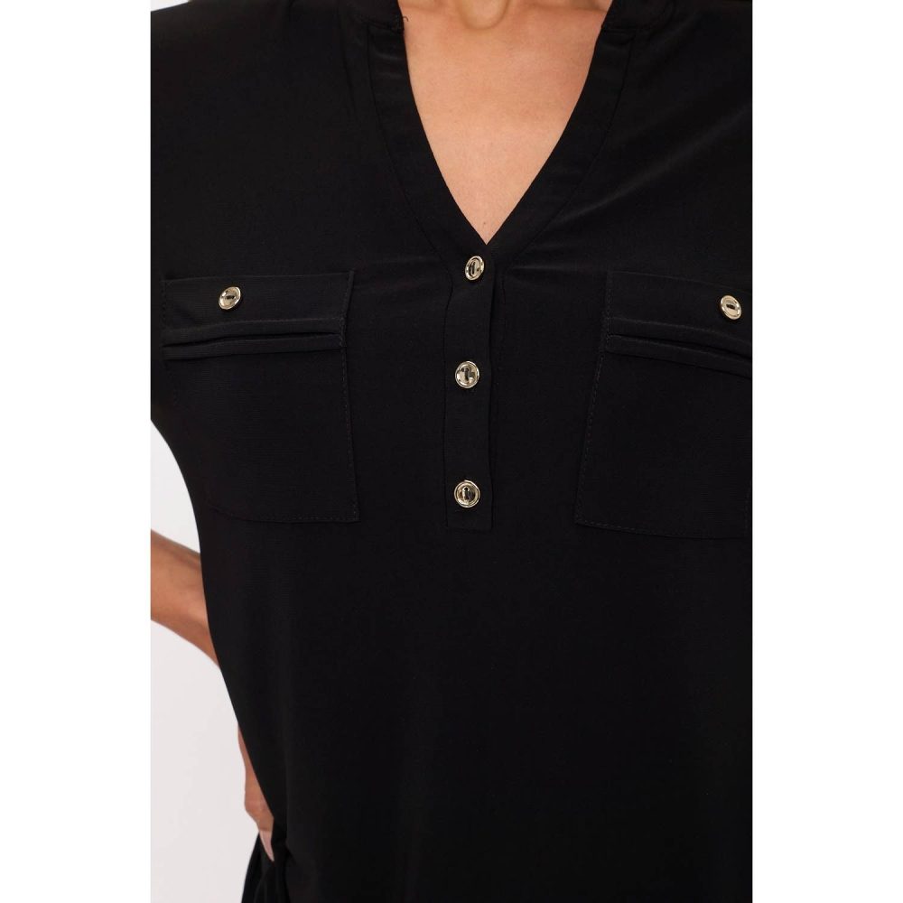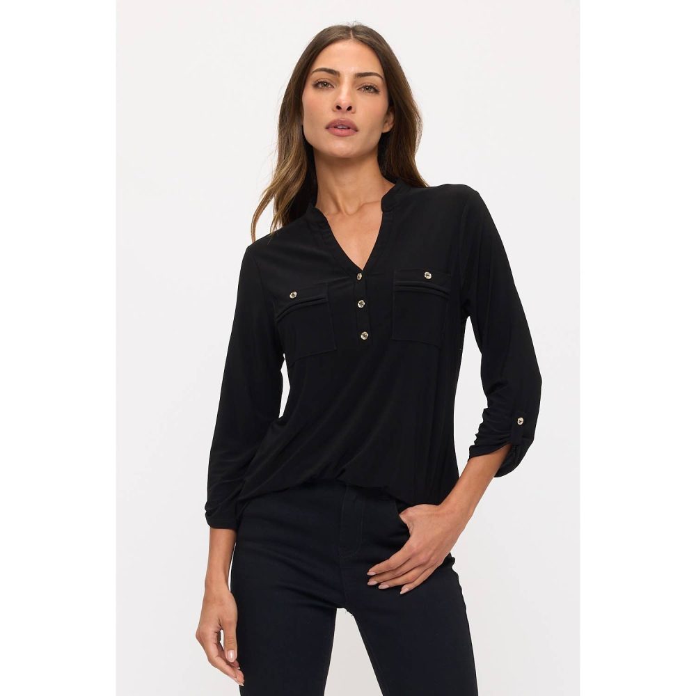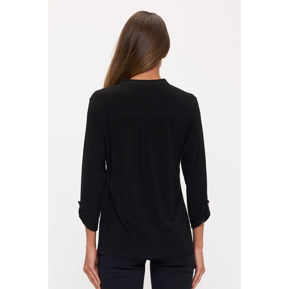 Lightweight and stretchy – Mandarin collar round neck – Button front – 3/4 Roll-tab sleeves – Faux pockets – Relaxed fit