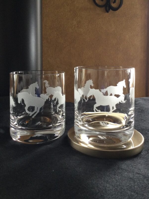 Playful horse design is sand carved by hand into the surface of each piece with attention to every detail. These elegant glasses will add a phenomenal touch to your cabin or western table or bar.
