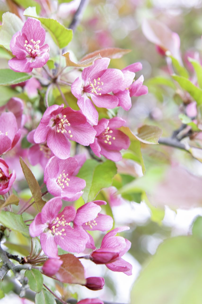 The apple blossoms bloom around Memorial Day weekend. A light rain was falling and created magic under the apple tree.
