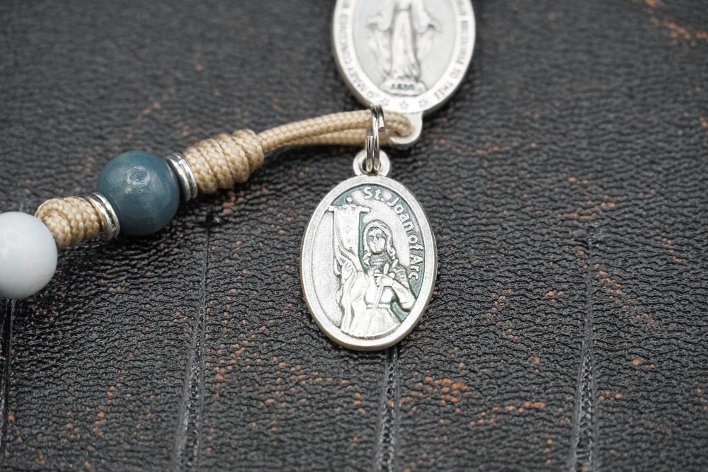 Each St. Joan of Arc Rosary is handcrafted in the USA using smooth dusty sky-blue wood Hail Mary beads paired with deep French blue wood Our Father beads. A silver toned Italian Pardon Crucifix and Miraculous Medal centerpiece are complemented by an attached St. Joan of Arc medal, representing courage, purity, and holy conviction.