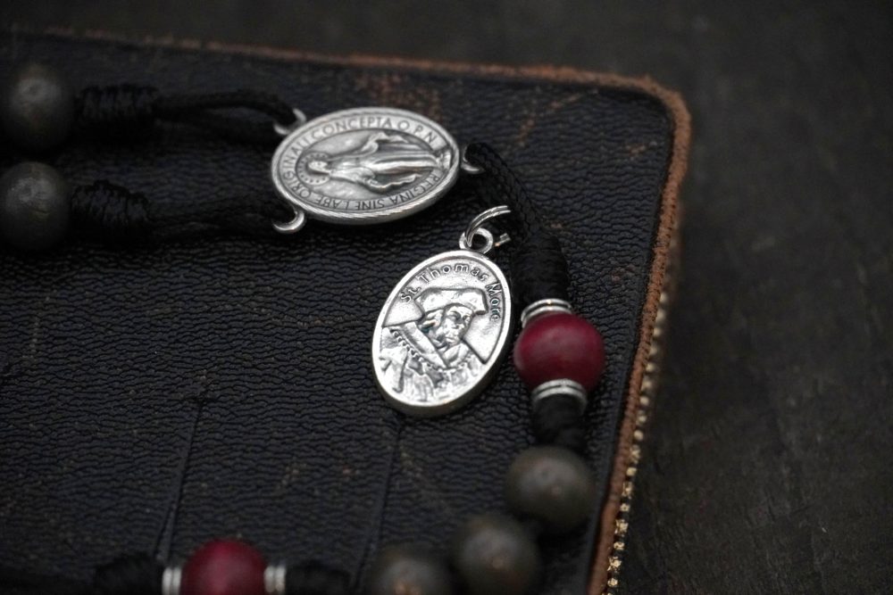 Each St. Thomas More Rosary is handcrafted in the USA using dark ash-grey wood Hail Mary beads paired with deep red stained wood Our Father beads. The high-quality Italian St. Benedict Crucifix and Miraculous Medal centerpiece are accompanied by an attached St. Thomas More medal, representing integrity, intellect, and courage in the face of trial.