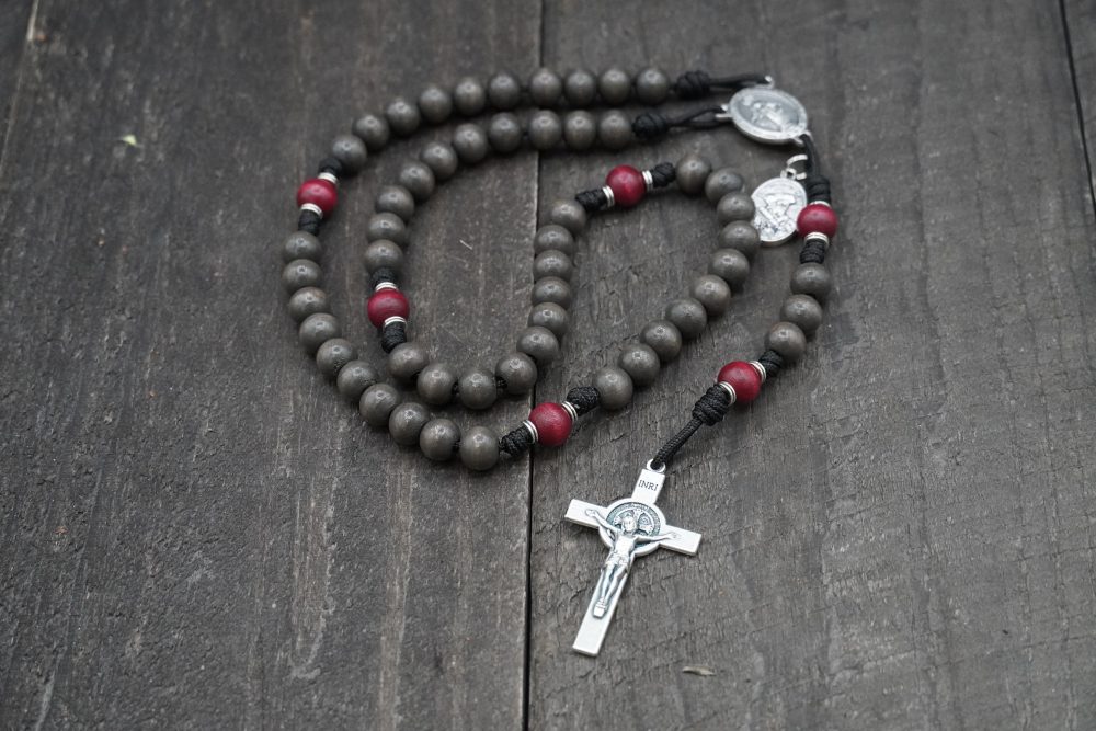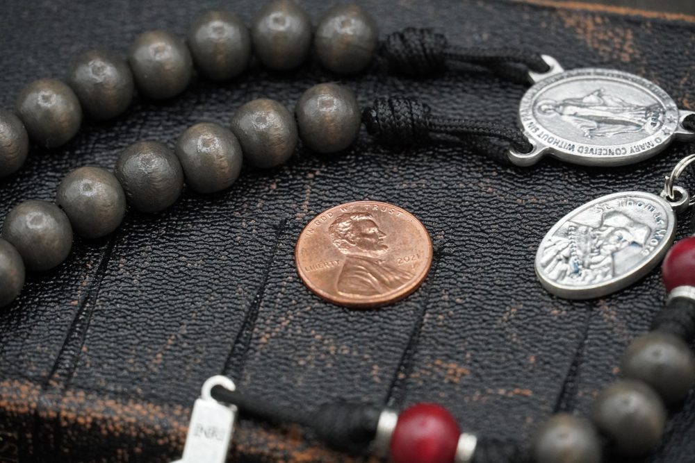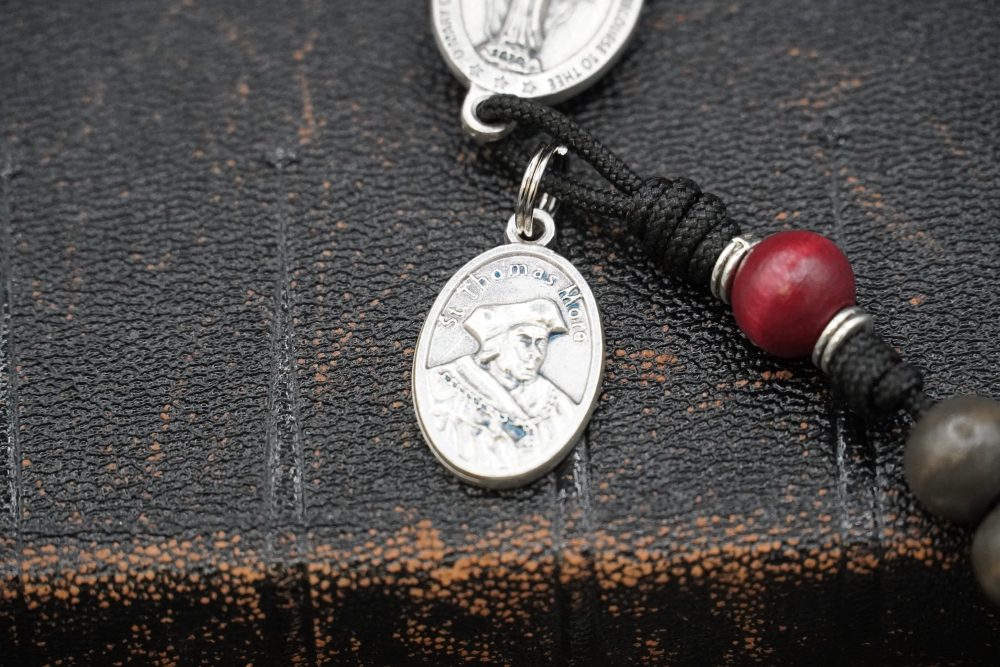 Each St. Thomas More Rosary is handcrafted in the USA using dark ash-grey wood Hail Mary beads paired with deep red stained wood Our Father beads. The high-quality Italian St. Benedict Crucifix and Miraculous Medal centerpiece are accompanied by an attached St. Thomas More medal, representing integrity, intellect, and courage in the face of trial.