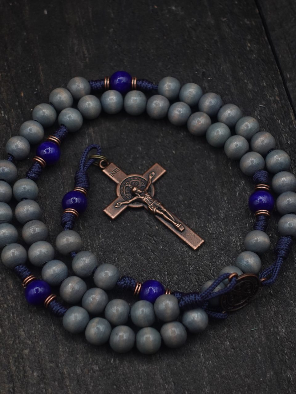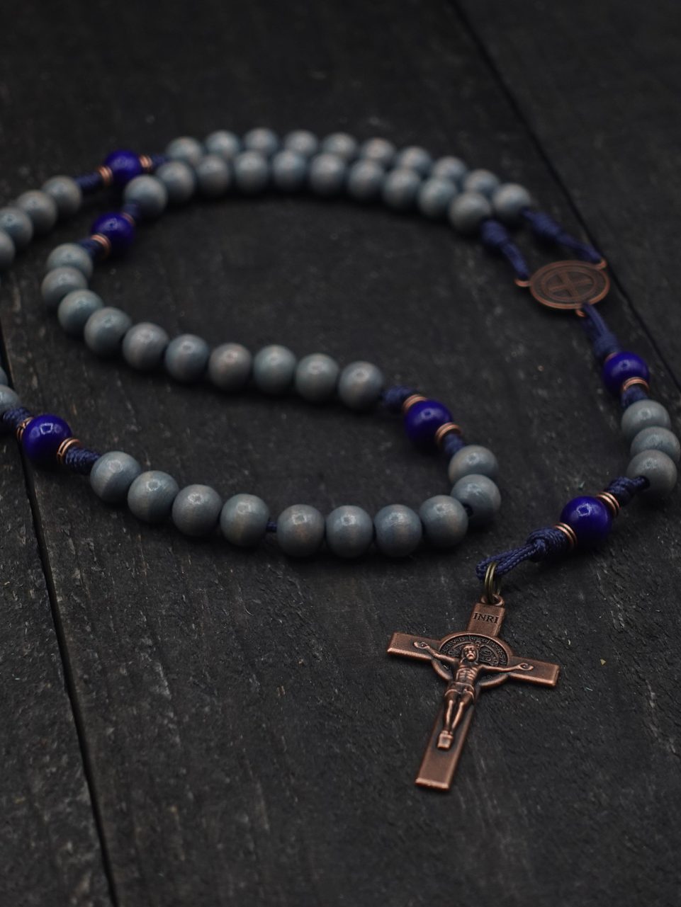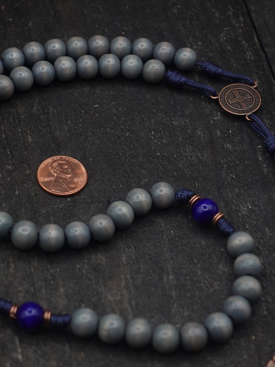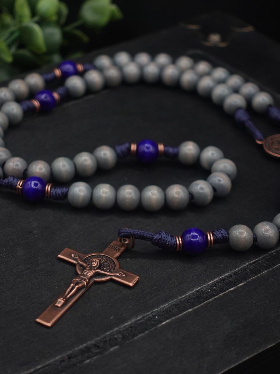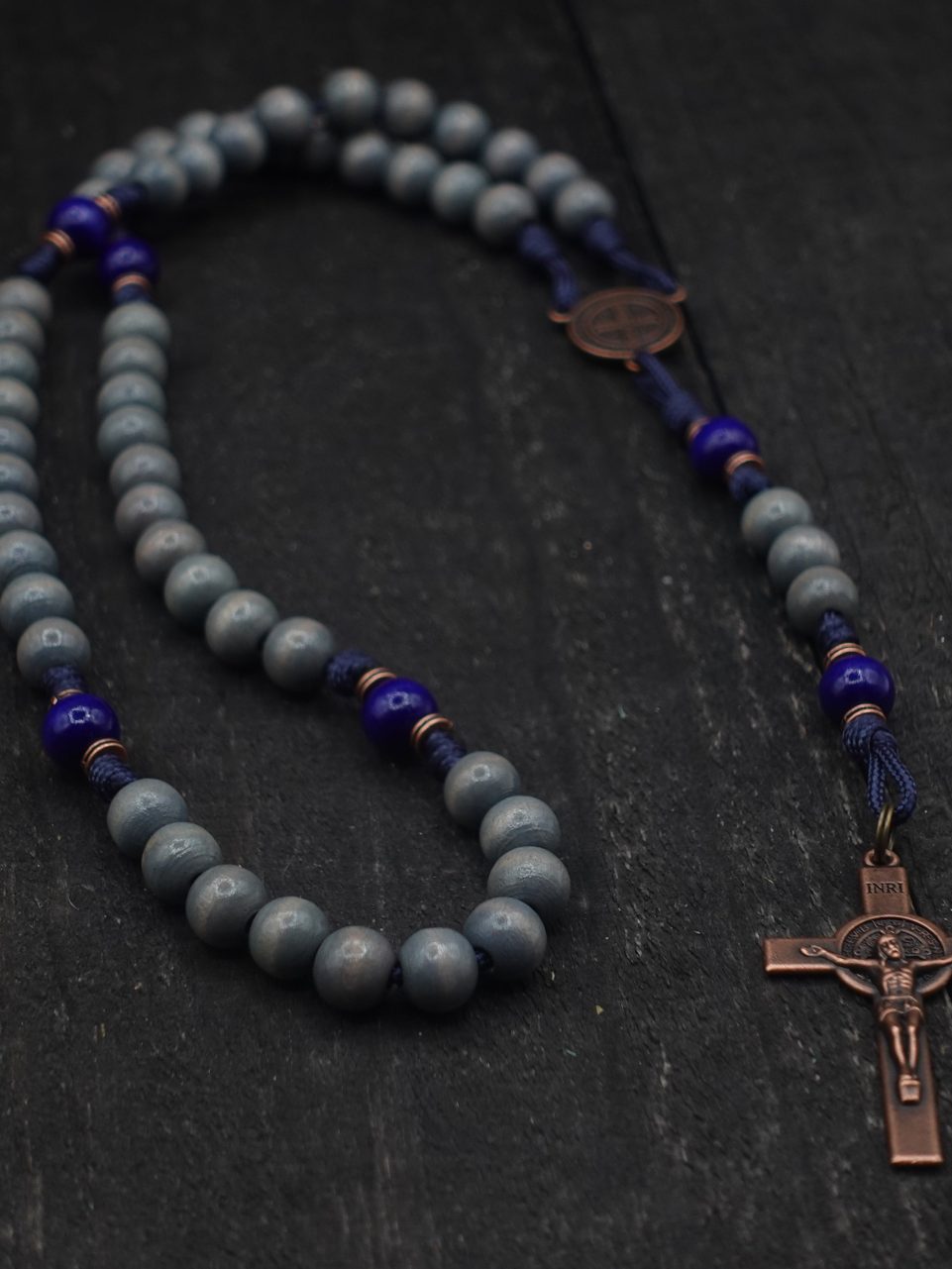 The Sword of the Spirit rosary is a stunning combination of warm and cool tones. Featuring medium-large Lunar Blue and Royal Blue beads, this strong and beautiful rosary is strung on durable USA made navy 95 paracord with a copper St. Benedict crucifix and centerpiece. Each bead is uniquely stained, making no two rosaries the same. Compact yet durable, this rosary is designed in Fargo, ND to inspire daily prayer and devotion as requested by Our Lady of Fatima.