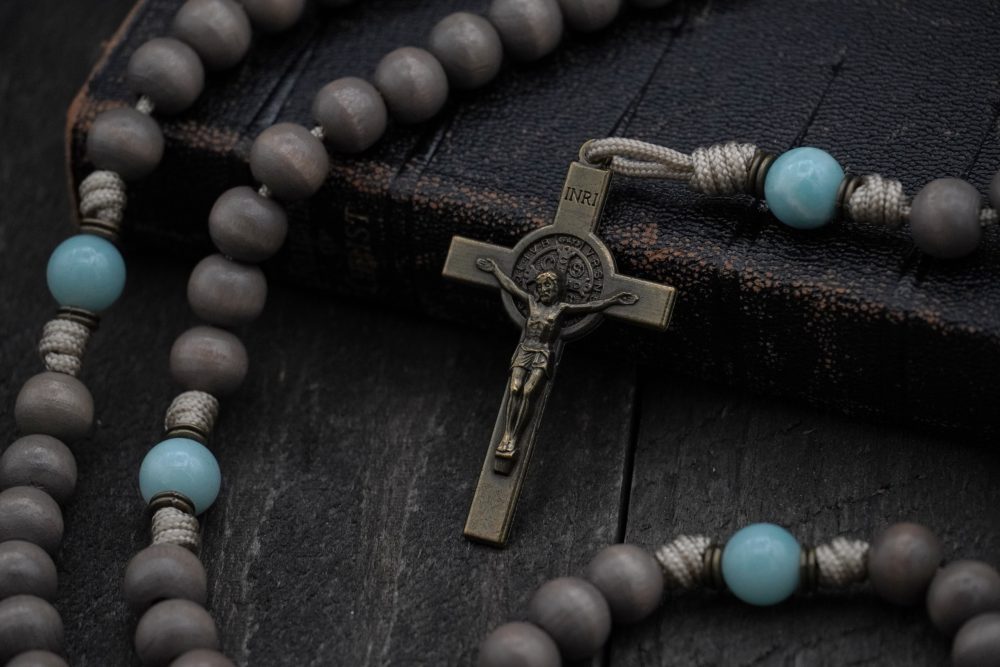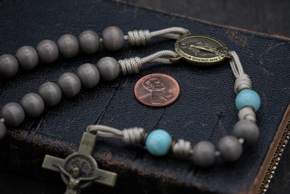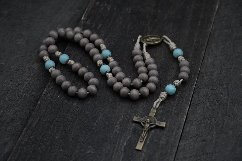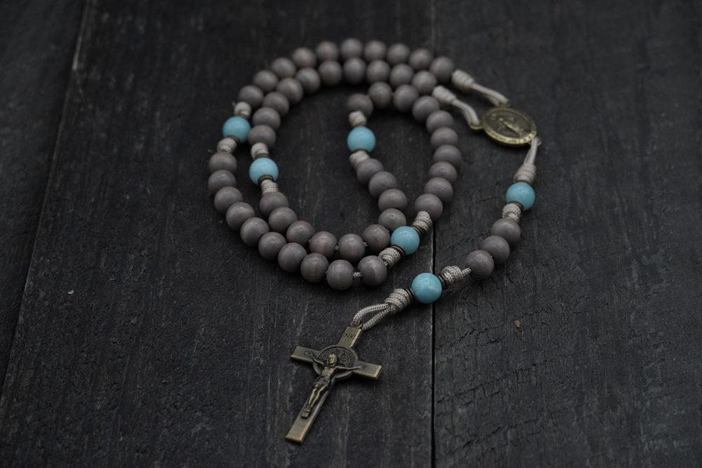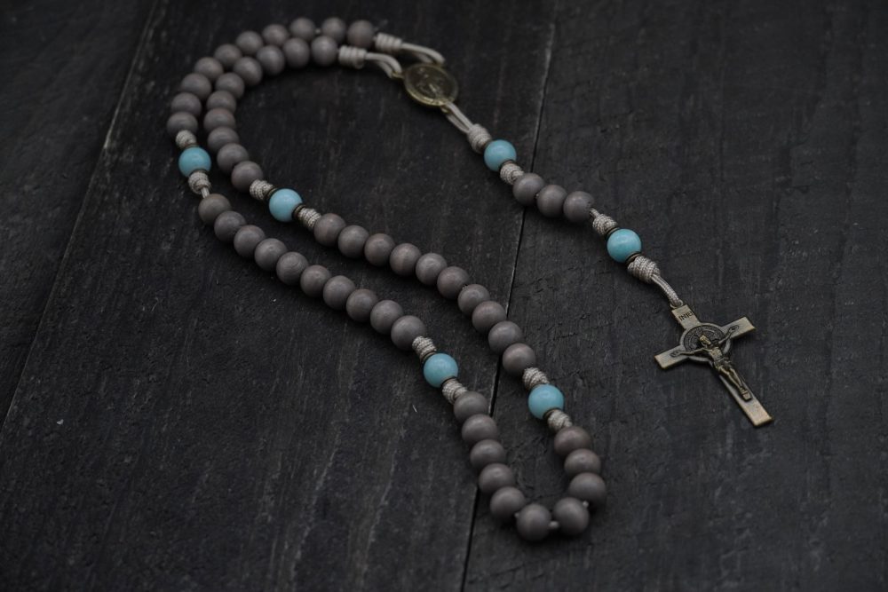 Each Guardian Rosary is handcrafted in the USA using smooth stained light grey wood Hail Mary beads paired with genuine blue amazonite gemstone Our Father beads. A high-quality Italian Benedictine Crucifix and matching medal centerpiece complete the design in antique brass tones, reflecting strength, endurance, and sacred authority.