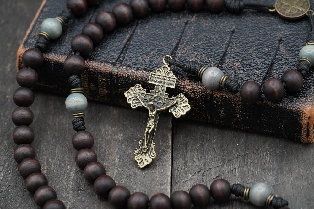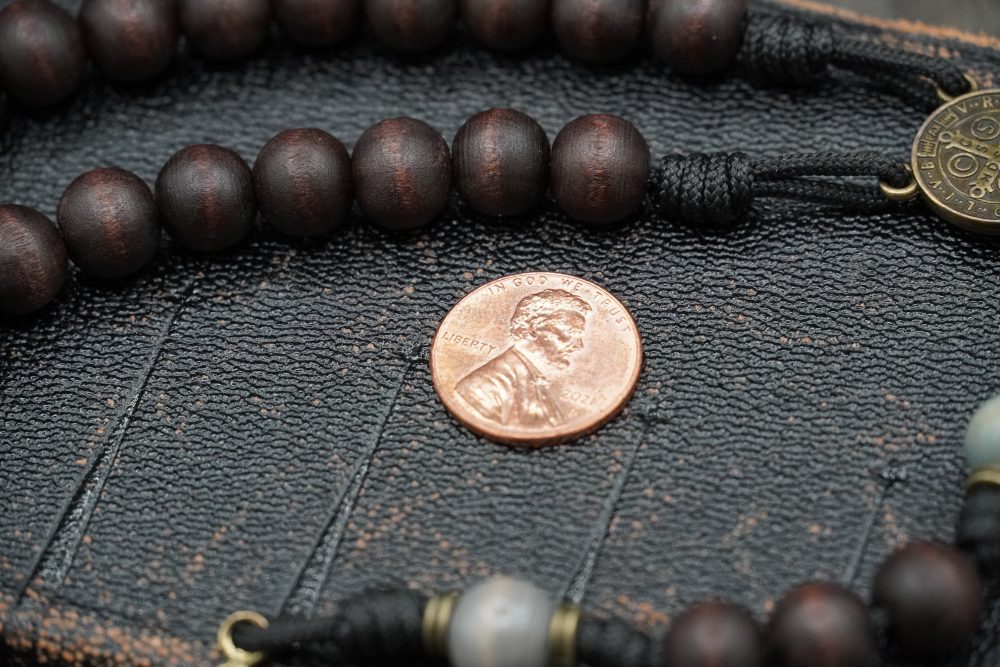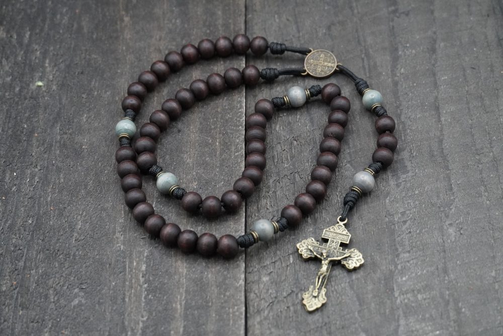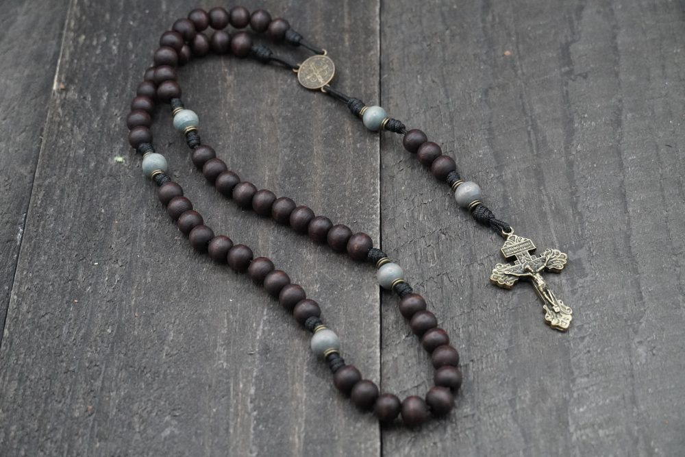 This rosary is made using beads that you can’t find anywhere else. The walnut and silver stained wooden beads are strung on durable black 95 paracord with a Bronze crucifix and centerpiece.