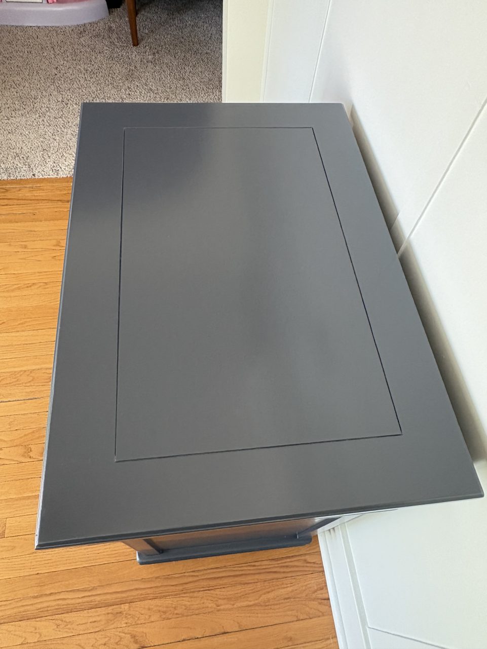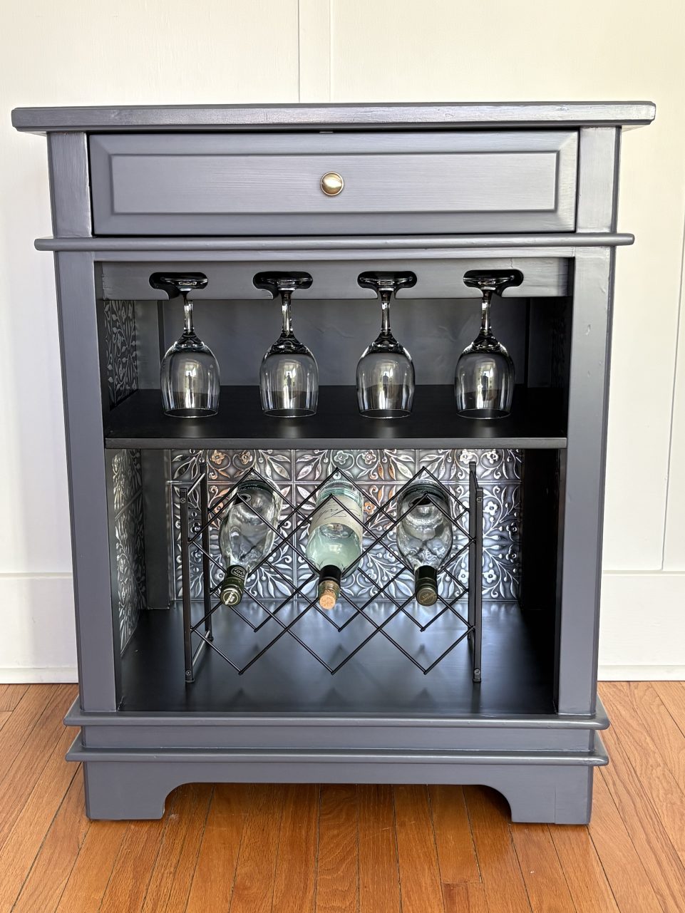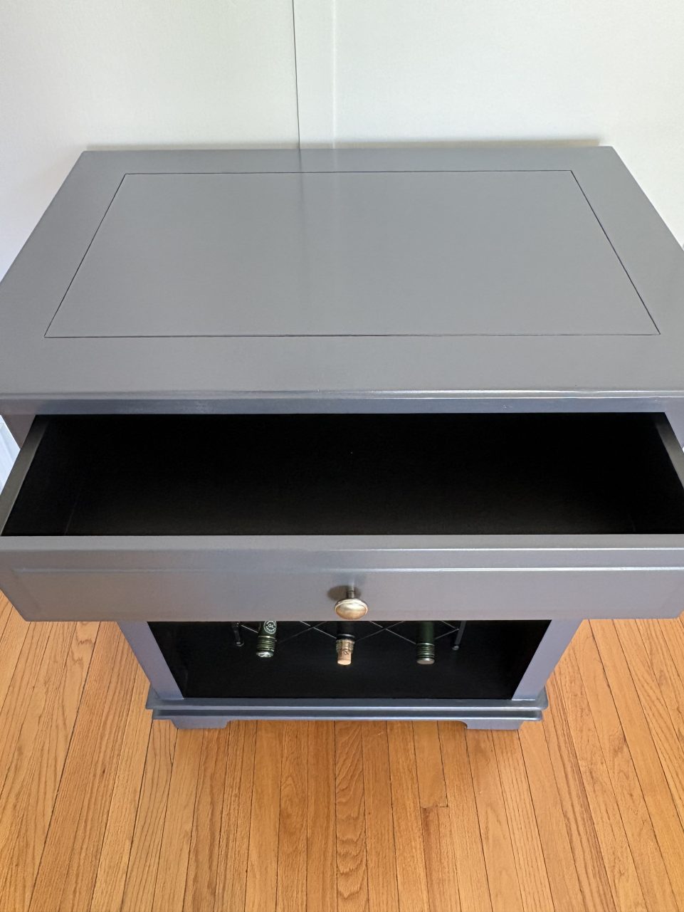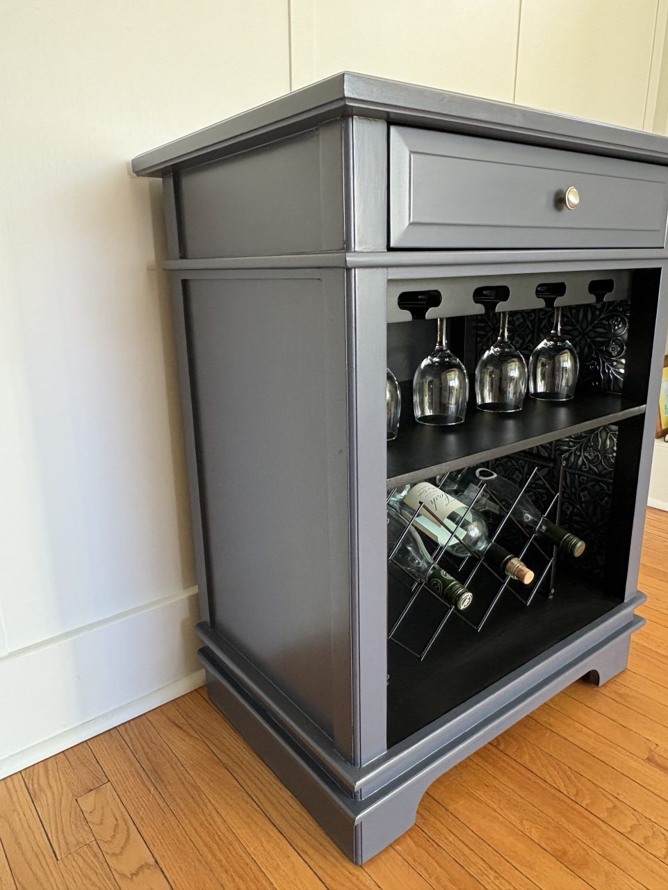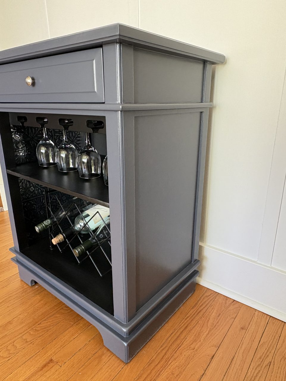 This large wine/alcohol cabinet has been updated in a dark navy called Evening Sky. The top has been sealed with polycrylic for durability.