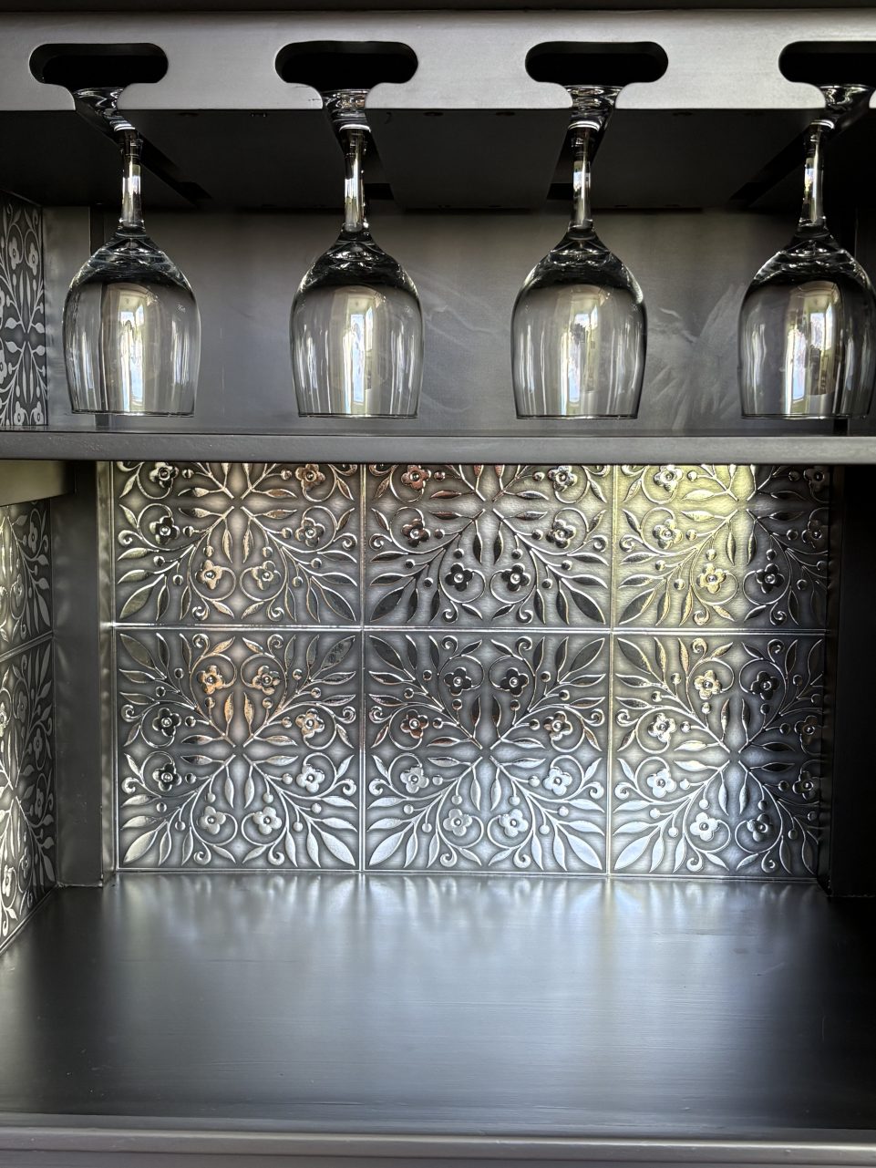 The inside has been dazzled with tile-like squares that have a metal look.